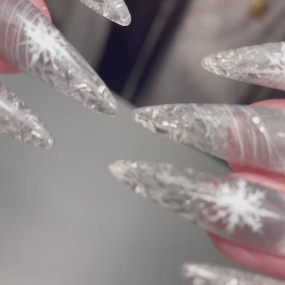 Embrace the enchanting beauty of winter with our stunning custom snowflake ice clear glass press on nails. Meticulously crafted with intricate details, these reusable nail enhancements capture the delicate artistry of frozen crystals, creating a mesmerizing and sparkling effect. Whether you're seeking a festive holiday look or a touch of whimsical elegance, our custom snowflake nails offer a versatile and eye-catching option.