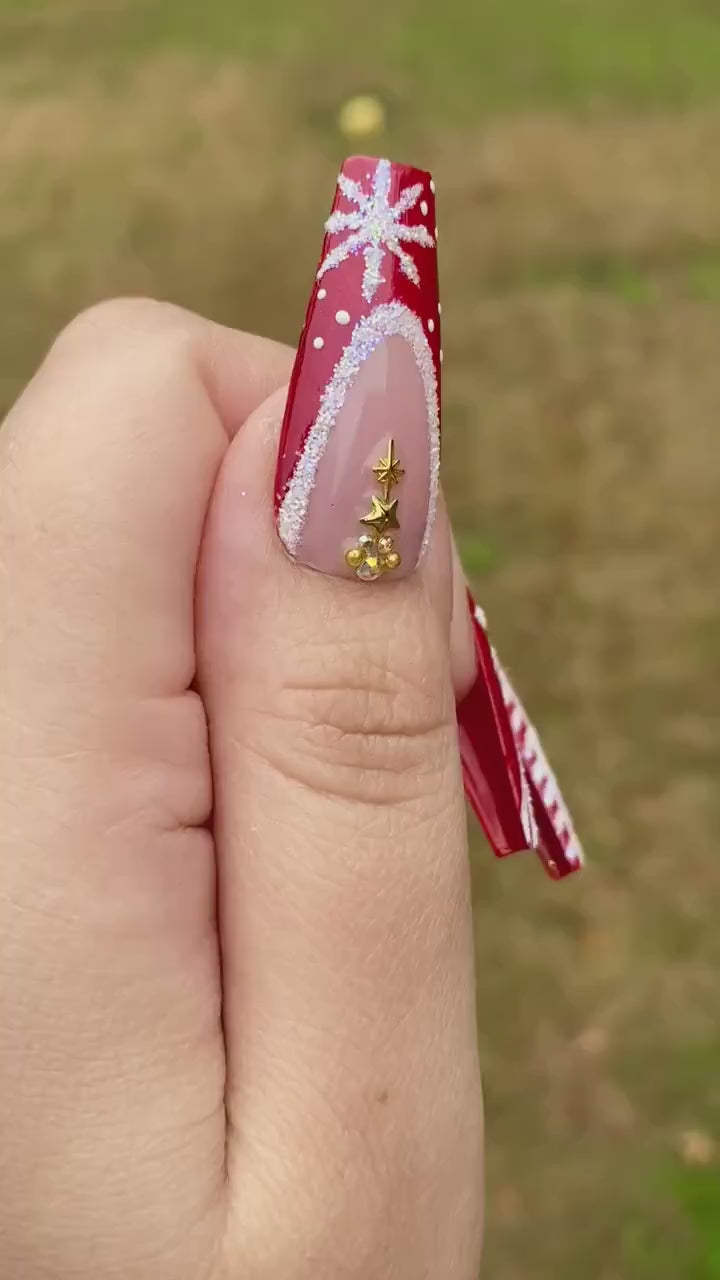 Glitter Diamond Snow in Red Christmas Press on Nails - Handmade Fingernails N81