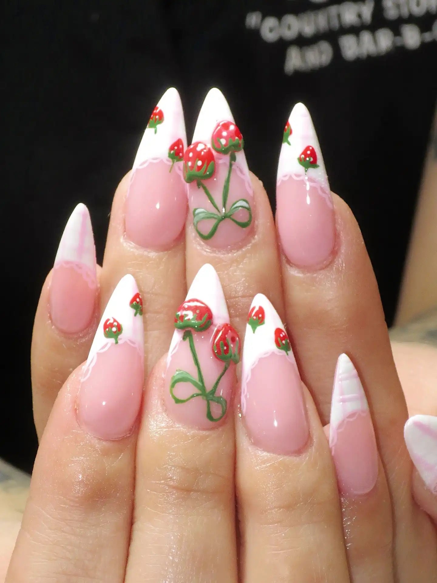 Add a sweet touch to your look with this handmade almond press-on set. Inspired by coquette aesthetics, it features a sheer pink base with white scalloped French tips, adorned with glossy strawberries and delicate green ribbon bows. Expertly crafted with premium gel, this playful and fruity manicure is reusable and fully customizable to your preferred shape and length.