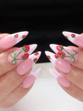 Handmade Pink White French Tip with Strawberry and Bow Press on Nails F86