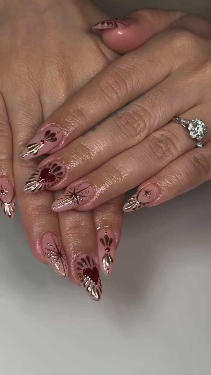 These handmade press-on nails in soft pink feature romantic heart and star designs with elegant gold accents, perfect for a dreamy look. Reusable and available in shapes like Oval or Stiletto, and lengths from Short to Long, they offer customizable designs for any event or daily wear. Ideal for hopeless romantics, they shine at date nights or anniversaries.