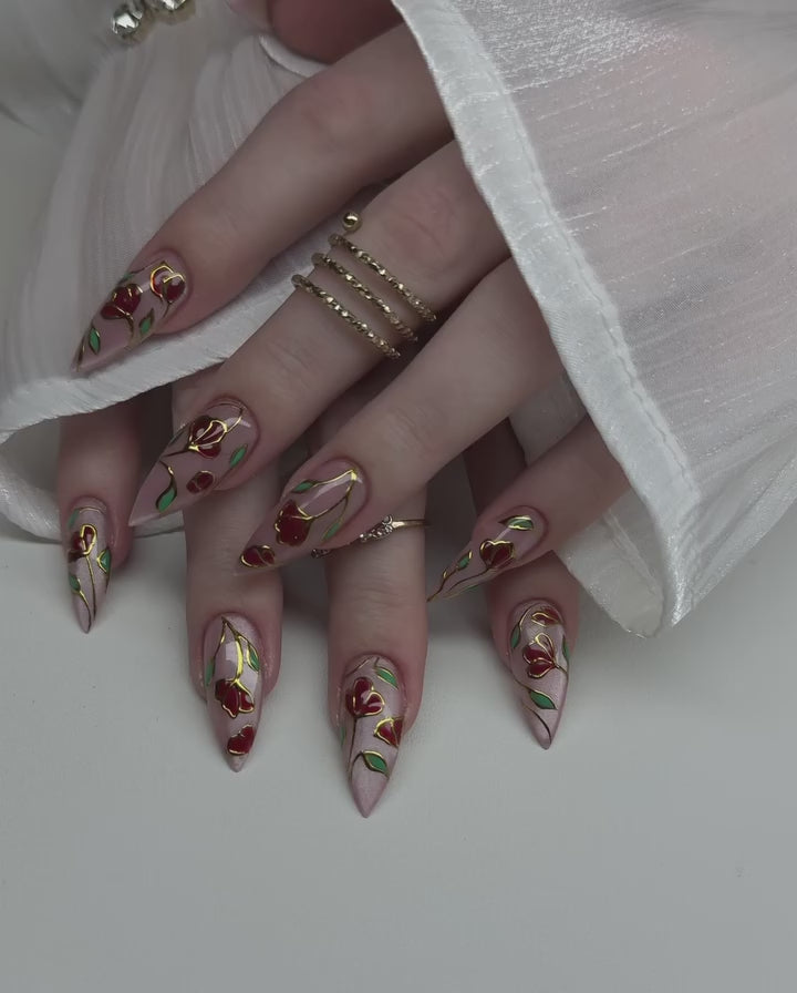These handmade press-on nails feature a stained glass-inspired rose gold floral design with delicate red blooms, green leaves, and gold detailing on a glossy nude base. Reusable and easy to apply, they offer a luxurious, long-lasting finish—perfect for romantics and art lovers. Ideal for weddings or garden parties, feel the delicate elegance on your fingertips. Available in Short, Medium, or Long, and shapes like Almond, Coffin, Oval, Square, or Stiletto.