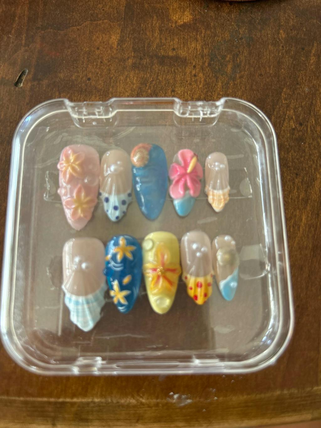 These handmade press-on nails bloom with tropical flowers, seashells, sand dollars, and beachy waves in vibrant pink, blue, yellow, and coral. Featuring a glossy finish and reusable, customizable designs in many shapes like Oval or Coffin, they’re perfect for summer vacations, pool parties, or island getaways. Ideal for fun-loving beach babes and tropical dreamers, this set brings paradise to your fingertips.